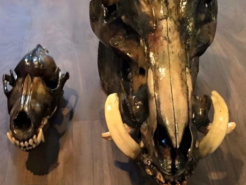 Skull Comparison: A comparison of an adult wolf's skull next to a wild boar's skull illustrates the boar's significant size.