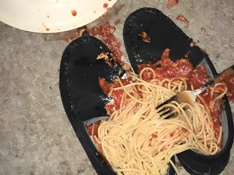 Incident Overview: Culinary Catastrophe: It seems that this individual accidentally tossed their entire plate of spaghetti into their slippers. The sight of spaghetti nestled precisely inside the shoes, with very few crumbs on the surrounding surface, suggests a rather dramatic misplacement.