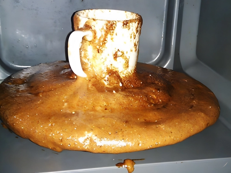Vorfallübersicht: Unklare Quelle: Es ist ungewiss, ob das Problem von der Tasse selbst oder deren Inhalt ausging. Das Bild deutet darauf hin, dass die Tasse leer erscheint, was auf eine starke Explosion hindeutet, die den Inhalt in der gesamten Mikrowelle verteilte.