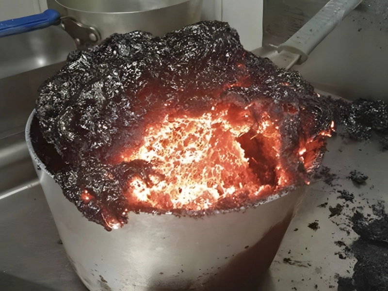 Verbrannte Überreste: Bei der Rückkehr in die Küche signalisierte der Geruch von Verbranntem, dass etwas schrecklich schiefgelaufen war. Das einst süße Karamell hatte sich in eine verkohlte, klebrige Masse verwandelt.