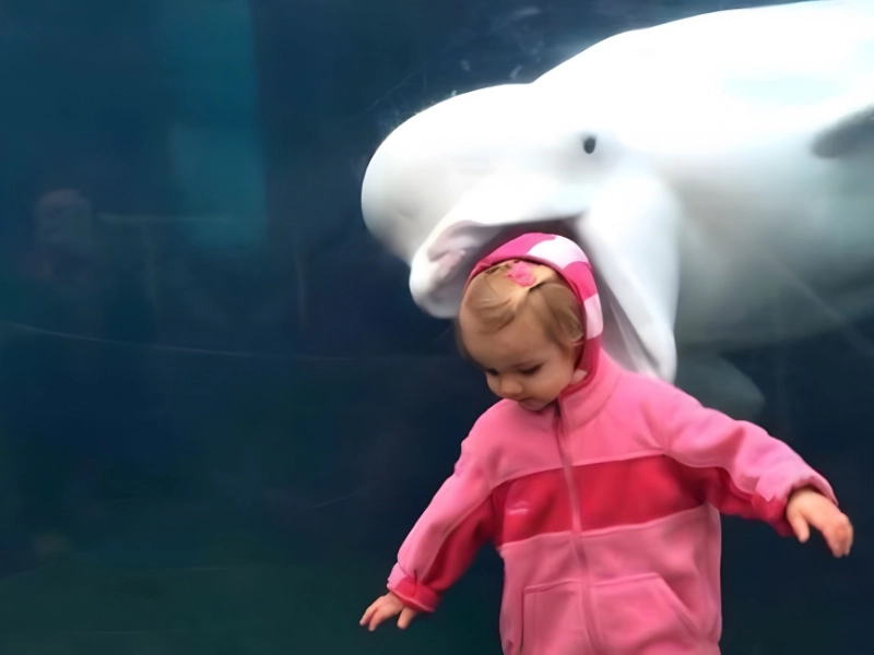 Dieser Delfin wirkt neugierig auf einen Snack, während das Kind nichtsahnend schaut. Zum Glück sorgt dickes Glas für sicheren Abstand.