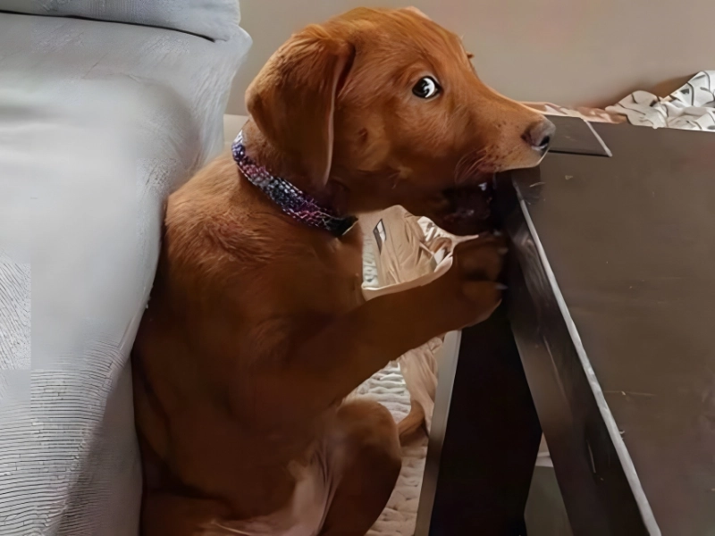 Hunde perfektionieren den Unschuldsblick. Hier wird ein Welpe beim Kauen am Tisch ertappt und wirft seinem Menschen einen schuldbewussten Blick zu, als sei ein anderer schuld.