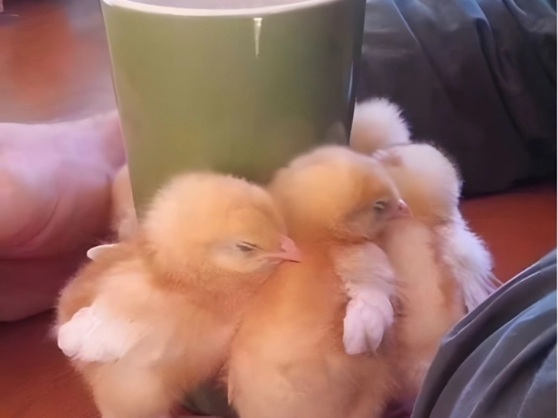 Kaum etwas ist niedlicher als Küken. Diese drei Tage alten Kleinen schmiegen sich an eine warme Kaffeetasse, um Komfort und Wärme zu suchen.