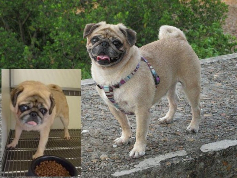 Das frühe Foto zeigt Mops Patches noch in der Eingewöhnung, mit leicht unsicheren Augen. Später sieht man einen souveränen Begleiter mit weicher Mimik und ausbalancierter Haltung. Online geteilt, liefert der Kontrast leisen Beweis: Geduld, Struktur und Zuneigung machen aus einem übrig gebliebenen Tier ein geliebtes Familienmitglied.