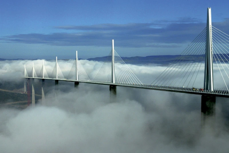 Dank moderner Materialien und Verfahren fügt sich der Stahlfahrbahnträger harmonisch in die Landschaft. Umfangreiche Sicherheitsstandards sorgen für eine verlässliche Überquerung auf der A75 zwischen Paris und Barcelona.