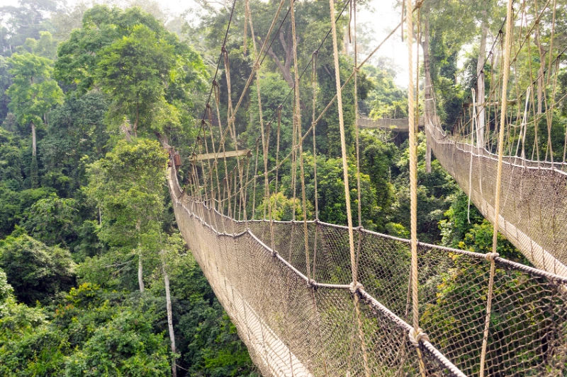 Der Canopy Walk im Kakum‑Nationalpark in Ghana gehört zu den wenigen Baumkronen‑Pfaden Afrikas. Über sieben Hängebrücken erschließen Besuchende den Regenwald von oben und erhalten seltene Einblicke in Tierwelt und üppiges Ökosystem – ein lehrreiches Naturerlebnis mit besonderer Aussicht.