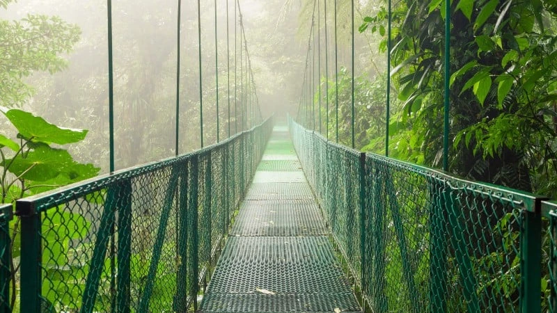 Im üppigen Nebelwald von Monteverde führen mehrere Hängebrücken auf Höhe der Baumkronen durch das Grün. Die schwankenden Stege eröffnen einzigartige Perspektiven auf Blätterdächer, farbenprächtige Vögel und eine artenreiche Pflanzenwelt. Der Regenwald bleibt ein ursprünglicher Lebensraum; die Wege vermitteln ein Gefühl von Abenteuer und erinnern daran, mit Achtsamkeit zu gehen.