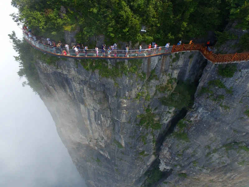 Der Tianmen Skywalk klammert sich in rund 1.430 Metern Höhe an die steilen Felsen des Tianmen‑Gebirges. Der gläserne Steg, nur etwa einen Meter breit, eröffnet den ungehinderten Blick in das Tal. Jeder Schritt ist ein kleines Abenteuer, ideal für Besuchende, die großartige Landschaften lieben und ihren Mut behutsam erproben möchten.