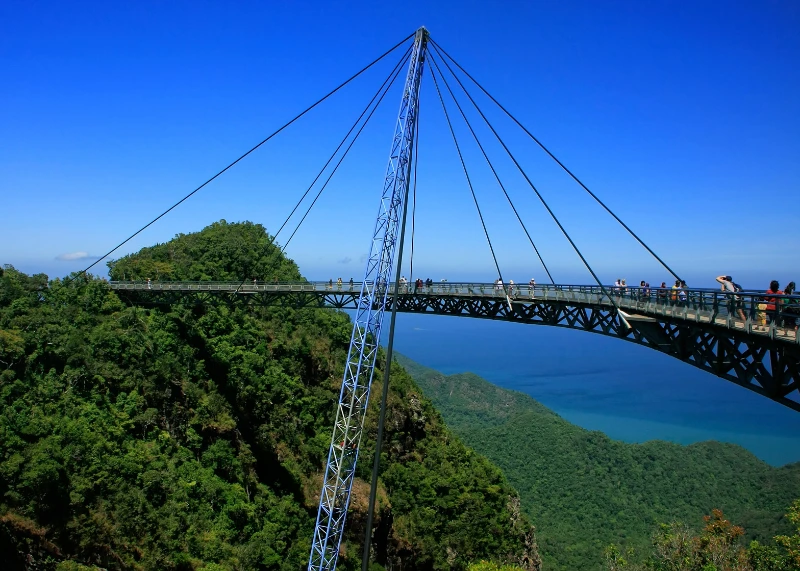 Hoch über dem Regenwald schwebt die Langkawi Sky Bridge als modernes Wunderwerk. Der Fußweg, von einem einzelnen Pylon und Seilen getragen, schwingt elegant über den Wipfeln – rund 660 Meter über dem Meeresspiegel. Die Anfahrt per Schrägaufzug steigert das Erlebnis zusätzlich. Das Rundum‑Panorama bleibt unvergesslich, während die schlanke Konstruktion ein Gefühl von Leichtigkeit vermittelt.