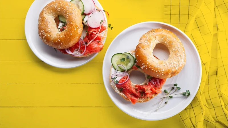 Bagels sind ein praktischer To-go-Klassiker, werden jedoch oft aus Weißmehl hergestellt und enthalten daher wenig Nährstoffe und Ballaststoffe. Gängige Füllungen wie Frischkäse oder gepökeltes Fleisch liefern viel Fett und Salz. Besser: Bagels seltener genießen und mit magerem Frischkäse, Räucherlachs oder Nussmus kombinieren.