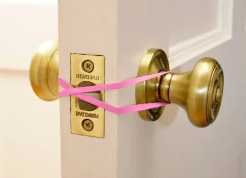 Wenn eine Tür vorübergehend nicht zufallen soll legen Sie ein breites Gummiband über beide Griffe sodass es über der Falle verläuft. Die Falle bleibt zurückgezogen und die Tür steht leicht offen. Ideal beim Tragen mehrerer Gegenstände oder kurzzeitigem Lüften.