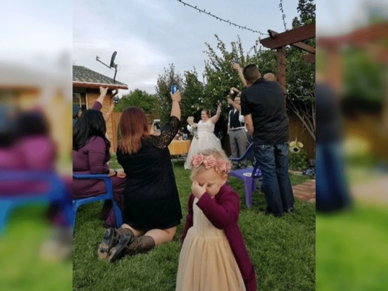 Der ehrliche Kommentar des Kindes sagt alles: „Ich bin so verlegen wegen euch.“ Kinder sprechen oft aus, was alle denken, und sorgen so für ein Foto, das im Gedächtnis bleibt.