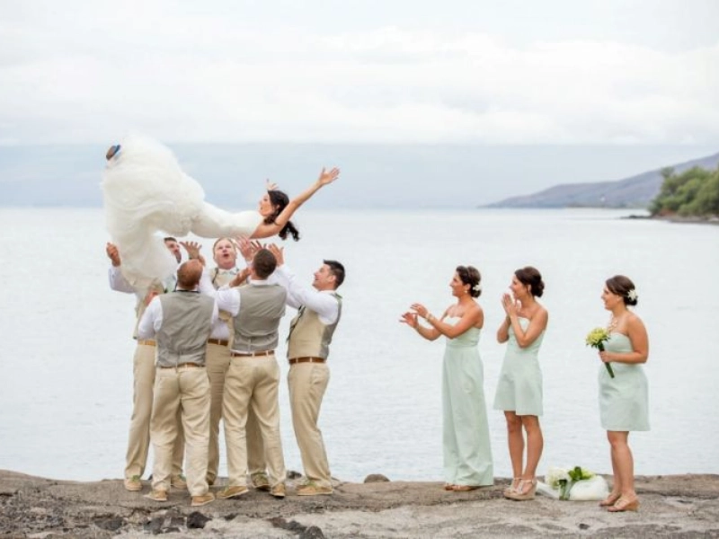 Ist das Werfen der Braut in der Nähe von Felsen eine neue Tradition? Die wagemutige Pose und das nervöse Kichern machen diese Aufnahme zugleich spannend und urkomisch – ein echter Nervenkitzel für alle.
