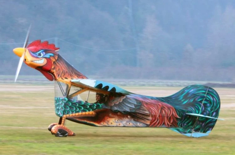 Dieses einmotorige Flugzeug im Hahn-Thema ist ein echter Hingucker. Auf den ersten Blick wirkt die Idee ungewöhnlich, doch hier wird kreative Modifikation mutig ausgereizt. Ob bestes oder gewagtestes Design bleibt Geschmackssache, aber die Entschlossenheit ist unverkennbar. Der Pilot mit Lederhaube und Schutzbrille führt das Konzept charmant fort. Die Kombination aus markantem Auftritt und passender Ausstattung macht das Erlebnis unvergesslich und zeigt, dass Fantasie und augenzwinkernder Humor hoch hinaus können – auch wenn es nicht die aerodynamischste Lösung ist.