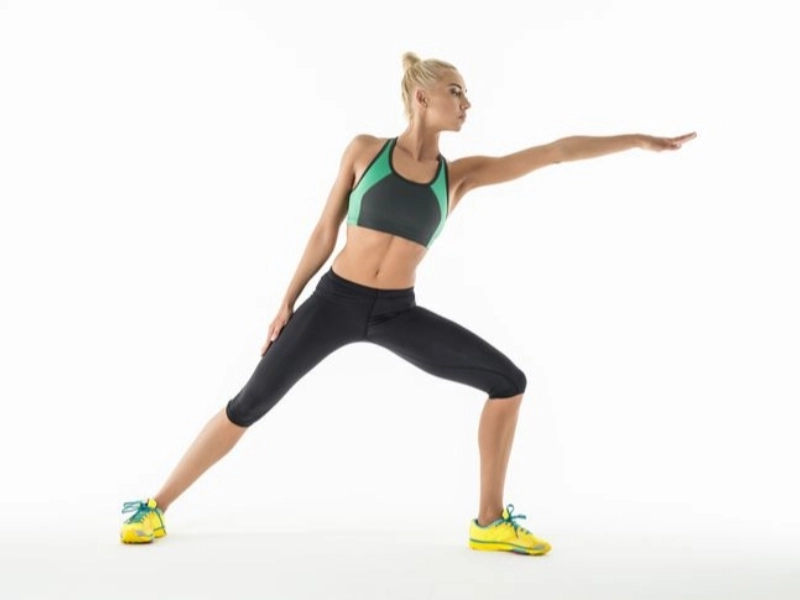 Stellen Sie die Füße 30–35 cm auseinander, Arme seitlich. Bauch sanft anspannen, ruhig atmen und das Gesäß zurückschieben, als würden Sie sich auf einen Stuhl setzen. Gehen Sie rechts in einen Ausfallschritt, strecken Sie den rechten Arm zur gleichen Seite und führen Sie die linke Hand am Körper entlang nach unten. Acht Sekunden halten, leicht nach rechts geneigt. Bewegen Sie sich nur seitlich, nicht nach vorn oder hinten. Pro Seite 2–3 Wiederholungen. Eine Einheit dauert etwa eine Minute. Bei Bluthochdruck oder Gelenkbeschwerden achtsam üben und die Intensität anpassen.