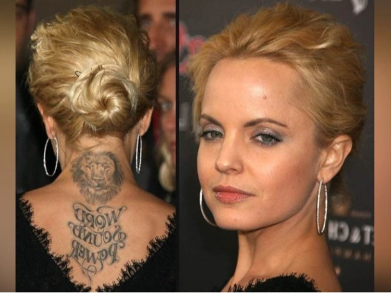 Mena Suvari trägt am Rücken die Worte Word Sound Power unter einem Löwenkopf. Dieses Tattoo steht für Stärke, Mut und die Wirkung von Worten.