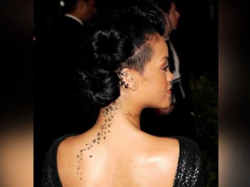 Rihannas charakteristische Tattoos: Kunst und Bedeutung Eines von Rihannas bekanntesten Tattoos ist ein Sternenmuster, das vom Nacken über den Rücken verläuft. Dieses Design verleiht Eleganz und einen Hauch von Traumhaftigkeit und steht für ihre Hoffnungen und Ziele. Die Sterne erinnern sie an die vielen Möglichkeiten, die vor ihr liegen.