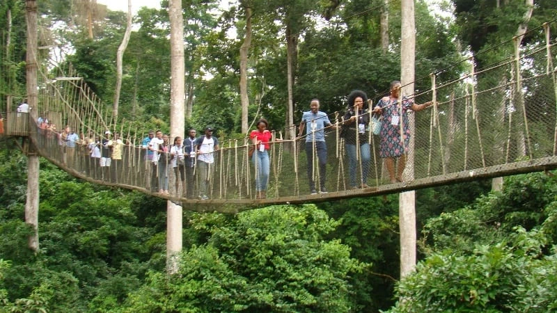 Erbaut im Jahr 1995, ist der Canopy Walk sowohl für Tourismus als auch für Forschung ausgelegt. Besucher können Vögel, Schmetterlinge und gelegentlich Affen oder Elefanten entdecken. Die frühen Morgenstunden sind ideal, um die Tierwelt zu beobachten und den Sonnenaufgang über dem nebligen Wald zu genießen.