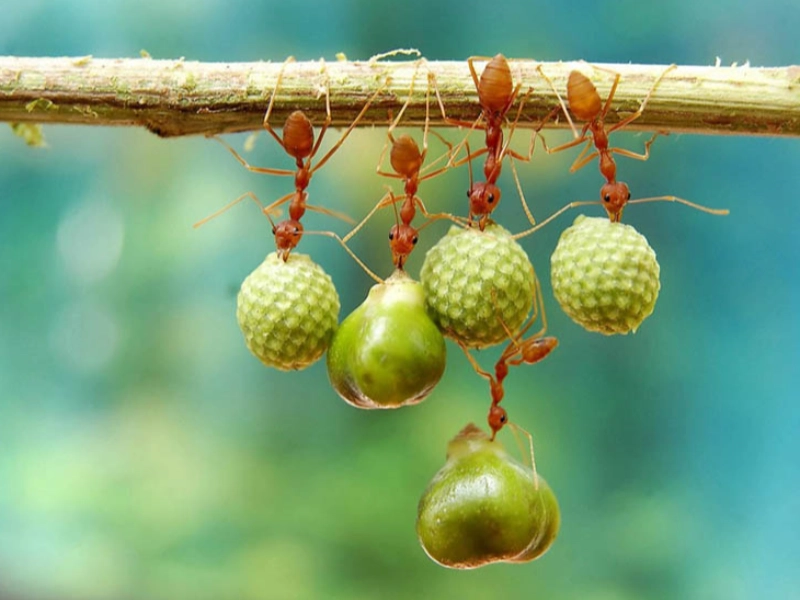 Ameisen sind Sinnbild für Zusammenarbeit und zielgerichtetes Handeln. Hier geben sie ihre mühsam errungene Nahrung nicht auf sondern koordinieren sich unbeirrt. Ihr gemeinsames Tragen zeigt die Stärke von Kooperation und verdeutlicht wie abgestimmtes Wirken große Wirkung entfalten kann. Ein Bild das Gemeinschaft betont.