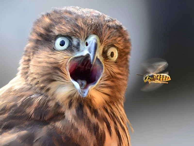 Ein dynamisches Nebeneinander einer Wespe und eines Vogels verdichtet Geschwindigkeit und Zielstrebigkeit. In einem Bildrahmen verschmelzen Richtung Tempo und stille Spannung. Es demonstriert wie verschiedenartige Arten parallel fokussiert handeln können und weckt Staunen über Präzision in Bewegung.