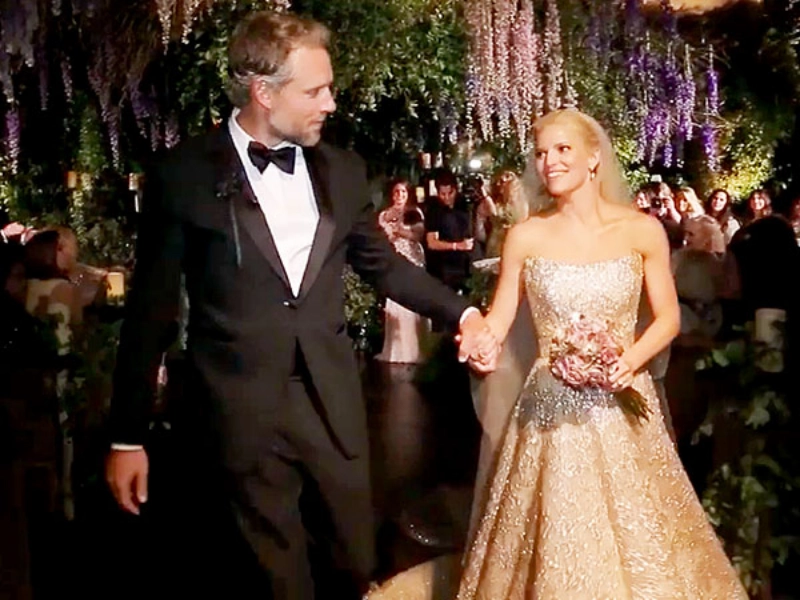 Jessica Simpson trug zudem eine eindrucksvolle marengofarbene Vera‑Wang‑Robe, die ihren Sinn für feine Eleganz zeigte. Die zarte Linienführung und edle Stoffqualität ließen sie strahlen und unterstrichen ihren zeitlosen Geschmack.