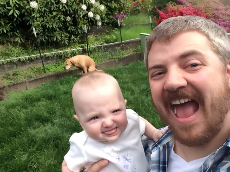 Hast du schon einmal ein Foto gesehen, auf dem es so wirkt, als würde ein Hund etwas Unpassendes genau über dem Kopf eines Babys machen? Es widerspricht der friedlichen Gartenszene und ist trotzdem zum Lachen. Normalerweise wertet so etwas ein Bild nicht auf, doch hier entsteht die optische Illusion, der kleine Hund sitze direkt auf dem Babykopf. Ein Motiv für das Familienalbum.