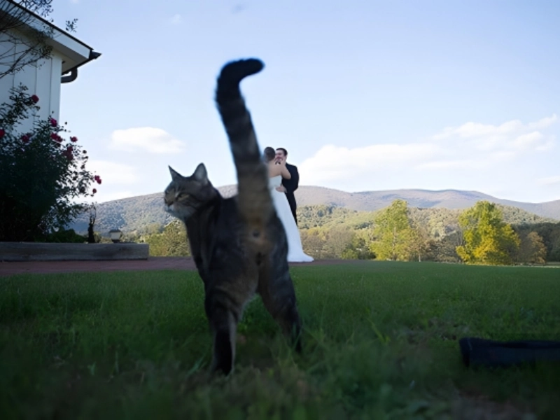 Ups, dieses Foto ist ziemlich frech. Katzen zeigen vertrauten Menschen gern mal ihr Hinterteil. Hier scheint die Katze ein deutliches Statement zur Hochzeit abzugeben. Vielleicht gibt sie dem frisch vermählten Paar einen augenzwinkernden Hinweis. Genau dafür lieben wir Katzen – ihre Kühnheit macht jeden Moment unvergesslich.