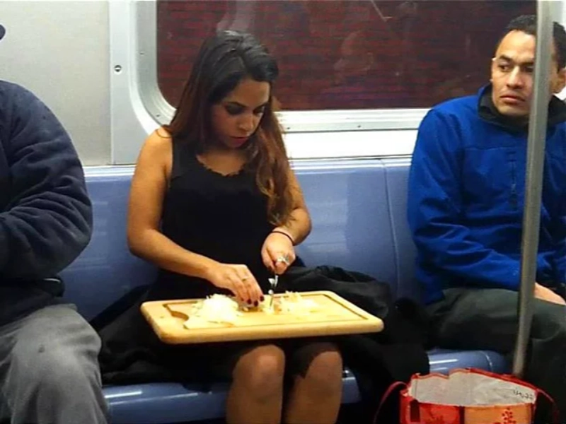 Warum mit dem Abendessen warten, bis man zu Hause ist? Diese tatkräftige Person begann die Vorbereitung direkt im Zug – Gemüse schneiden oder Zutaten zusammenstellen, routiniert und konzentriert. Ein vertrauter Duft lag in der Luft und weckte Vorfreude auf eine warme, liebevoll zubereitete Mahlzeit.