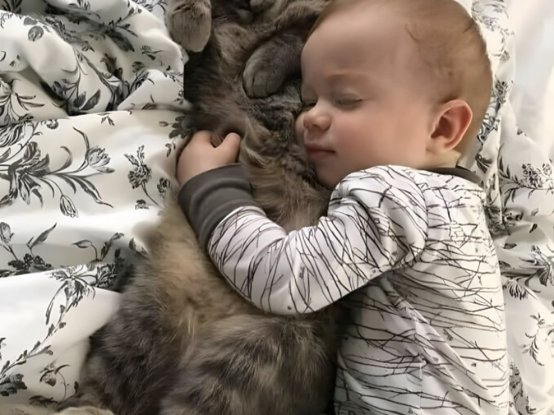Mit Tieren aufzuwachsen ist ein Geschenk das Empathie Fürsorge und Verantwortungsgefühl fördert. Dieses zarte Bild deutet an dass das Kleinkind genau diese Werte bereits spielerisch erlebt während es sich vertrauensvoll an eine liebevolle Katze schmiegt.
