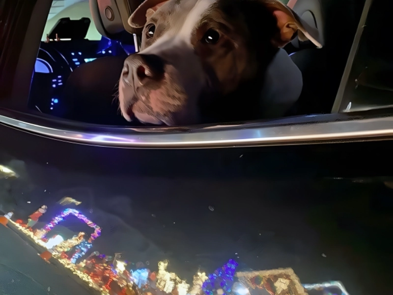 Tierhaltende Menschen investieren viel Herzblut um ihren Gefährten besondere Momente zu schenken. Diese Hündin wurde zu einer abendlichen Rundfahrt mit festlicher Beleuchtung mitgenommen und ihr ausdrucksvolles Gesicht verrät stille Begeisterung.
