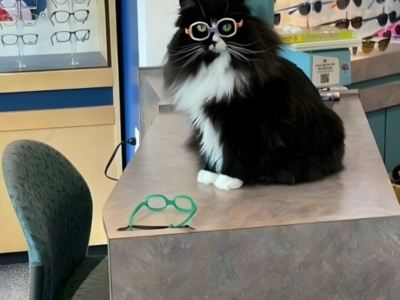 Für manche Kinder wirkt ein Besuch beim Augenarzt zunächst ungewohnt. Truffles die Katze hilft mit indem sie selbst Brillen trägt und so spielerisch Hemmungen abbaut Kinder fühlen sich entspannter und offen für Untersuchung und Beratung.