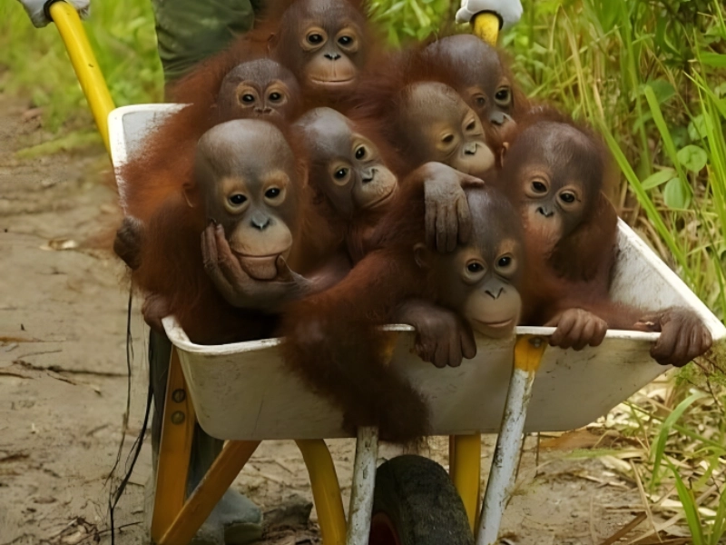 9. These orphaned baby orangutans ride their wheelbarrow school bus daily to Jungle School.