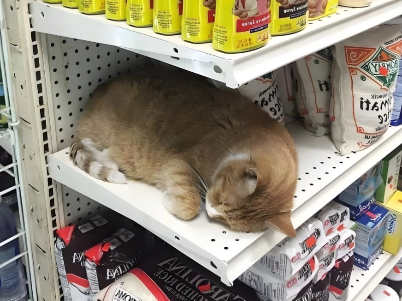 Mögliche Kamera iPhone Bezugsorte Amazon Walmart Apple Store Durchschnittspreis 500–1,200* Die Bildzeile lautet Zum Glück wieder vorrätig und bezieht sich auf die rundliche orange Katze die auf einem Warenregal döst. Sie wirkt als hätte sie Aufsicht oder gönne sich nach Kontrolle eine Pause.