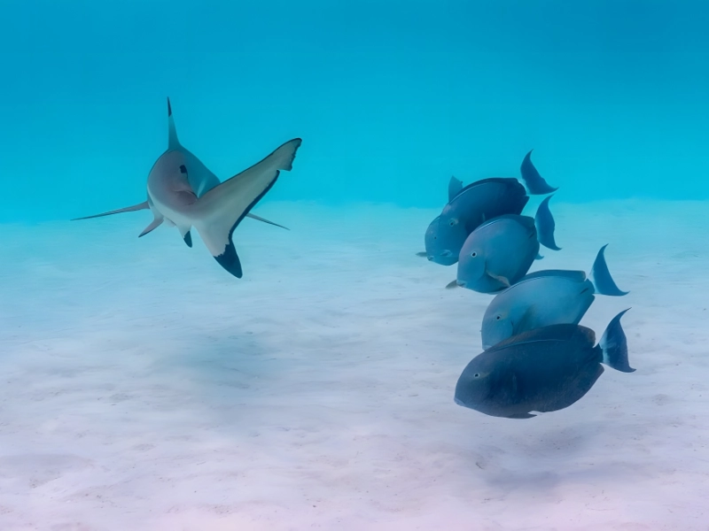 Dieses beeindruckende Foto zeigt vier Doktorfische, die einem Schwarzspitzen-Riffhai in Moorea, Französisch-Polynesien, folgen. Im Meer haben Haie Vorrang, und diese Doktorfische bleiben respektvoll ruhig, wenn ein Hai in der Nähe ist. Das Bild deutet Themen wie Präsenz und Fairness an und wurde in die Auswahl der Comedy Wildlife 2023 aufgenommen.