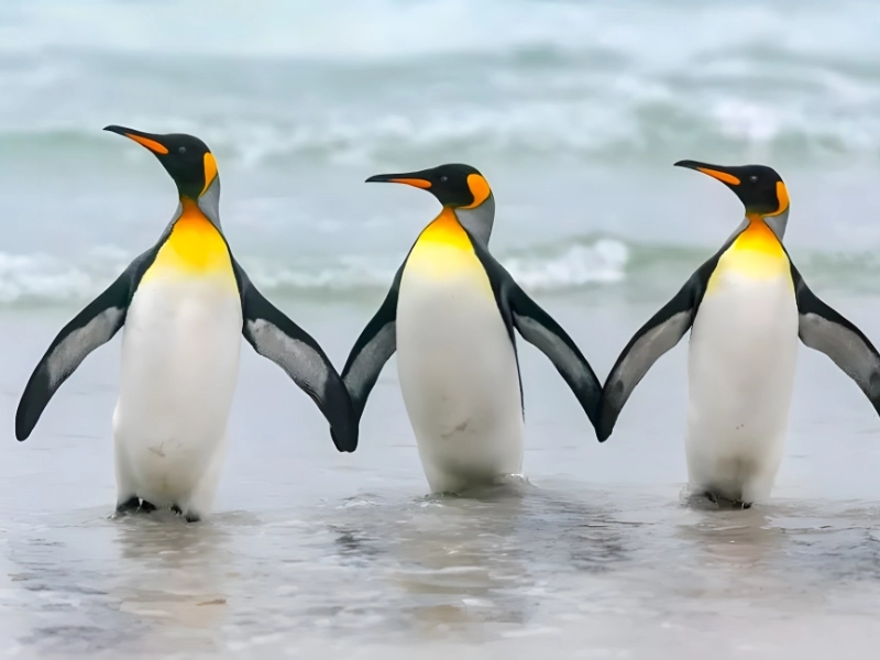 Dieses süße Bild zeigt drei Königspinguine, die am Strand entlangspazieren und sich an den Flügeln halten. Es wurde für die Comedy Wildlife 2023 ausgewählt und hebt die Parallelen zwischen tierischen und menschlichen Beziehungen hervor.