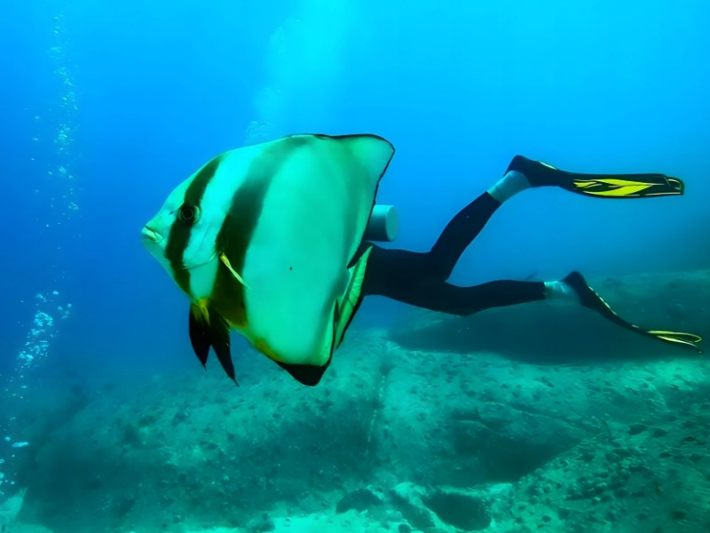 Auf diesem spielerischen Bild wird eine tauchende Person von einem davor vorbeiziehenden Fledermausfisch verdeckt – so entsteht die Illusion einer Meerjungfrau. Ein Glückstreffer für eine frisch zertifizierte Taucherin.