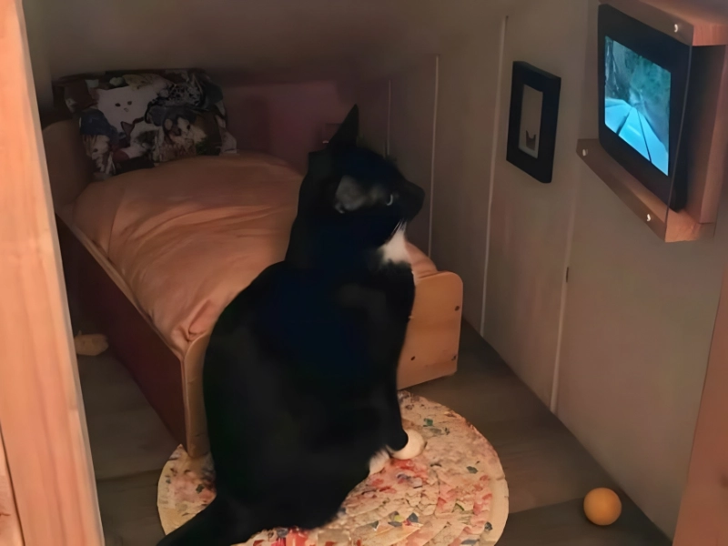 Diese entzückende Katze hat ihr eigenes Plätzchen unter der Treppe – ein wenig wie Harry Potters Zimmer, nur viel komfortabler. Der Bereich bietet einen runden Teppich, einen Spielball, einen kleinen Bilderrahmen und ein gemütliches Bett mit passendem katzenmotiviertem Kissen. Das Highlight: ein Fernseher.