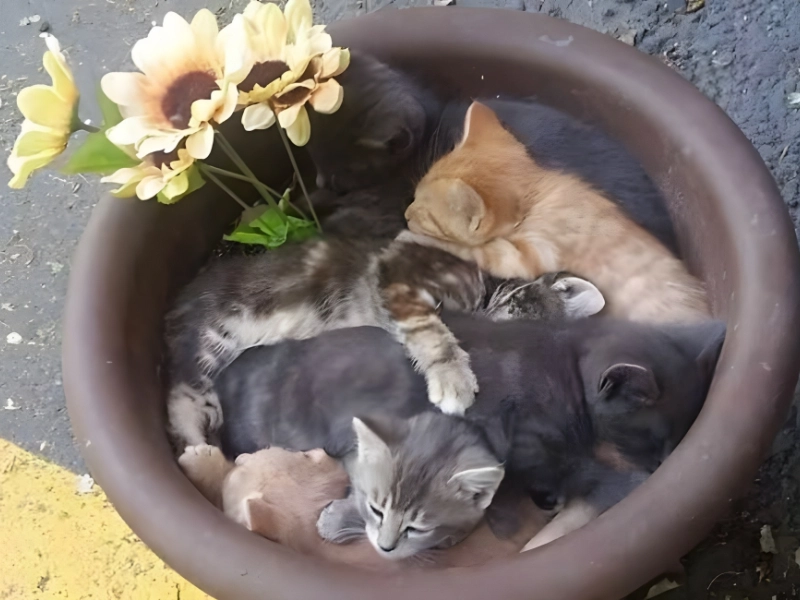 Jede Katzenhalterin und jeder Katzenhalter kennt den Moment, wenn eine Katze plötzlich auftaucht und an einem unerwarteten Ort gähnt. Dieses witzige Foto zeigt einen Topf voller zusammengerollter Katzen und fängt diesen herrlichen Überraschungsmoment perfekt ein.