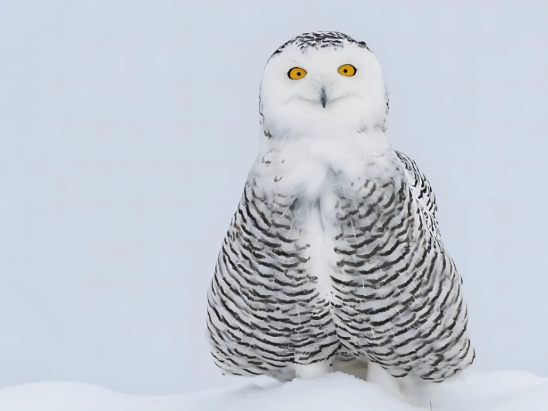 Dieses eindrucksvolle Foto erinnert an eine eisige Welt, in der nur Mutige unterwegs sind. Hier jedoch ist das Einzige, was überrascht, eine schneebedeckte Eule mit leuchtend gelben Augen, perfekt in der weißen Landschaft verborgen.