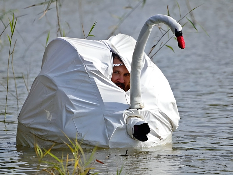 Hauptsache, der Schwan verwechselt ihn nicht. In Weiß gekleidet und gelassen treibend wirkt die Person wie Teil der eleganten Kulisse. Diese poetische Szene verwischt spielerisch die Grenze zwischen Mensch und Umgebung und sorgt für sanften Humor.