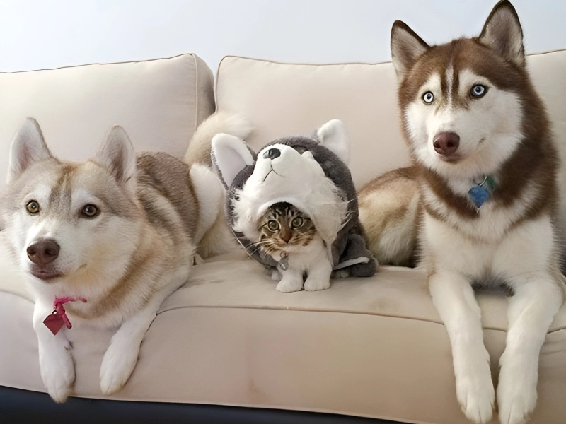 Haben die Hunde die versteckte Person schon entdeckt? Die Szene erinnert an ein heiteres Versteckspiel: Eine Figur fügt sich meisterhaft ein, während neugierige Vierbeiner nach Hinweisen suchen. Das Bild fängt Spannung und spielerische Suche gleichermaßen ein.