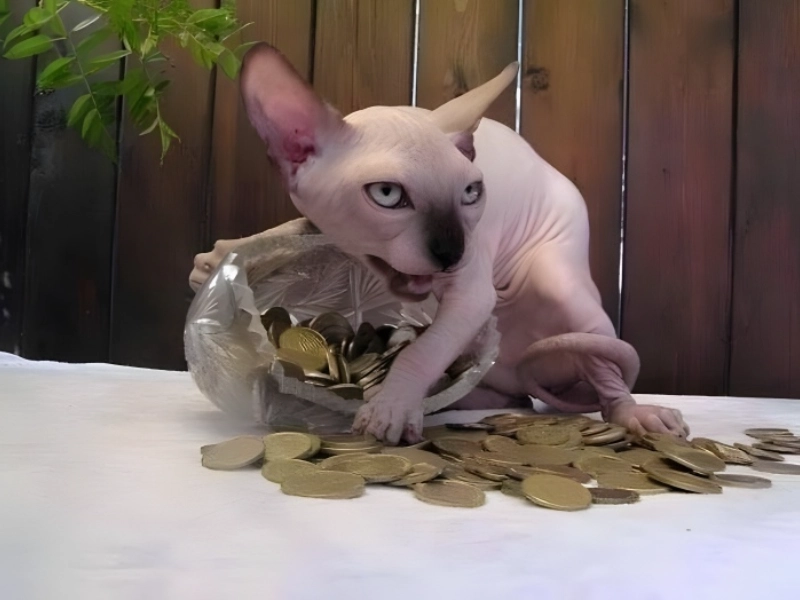 Die Szene wirkt wie aus einem skurrilen Heist-Film, mit einer Sphynx-Katze als Kopf der Operation. Ihr intensiver Blick und die schützende Haltung über dem Kleingeld ergeben ein bizarr-amüsantes Bild. Die Falten und das fehlende Fell verstärken die Dramatik, als bewache sie einen sagenumwobenen Schatz. Entstehen sofort neue Fragen: Hortet sie schon länger? Woher stammen die Münzen? Ist das eine katzengerechte Spardose? Die Körpersprache lässt vermuten, dass sie ihren Fund verteidigen würde – ein weiterer Beweis, dass Katzen uns mit ungewöhnlichen Marotten und ihrem scheinbaren Verständnis menschlicher Ideen, etwa vom Wert des Geldes, immer wieder überraschen.
