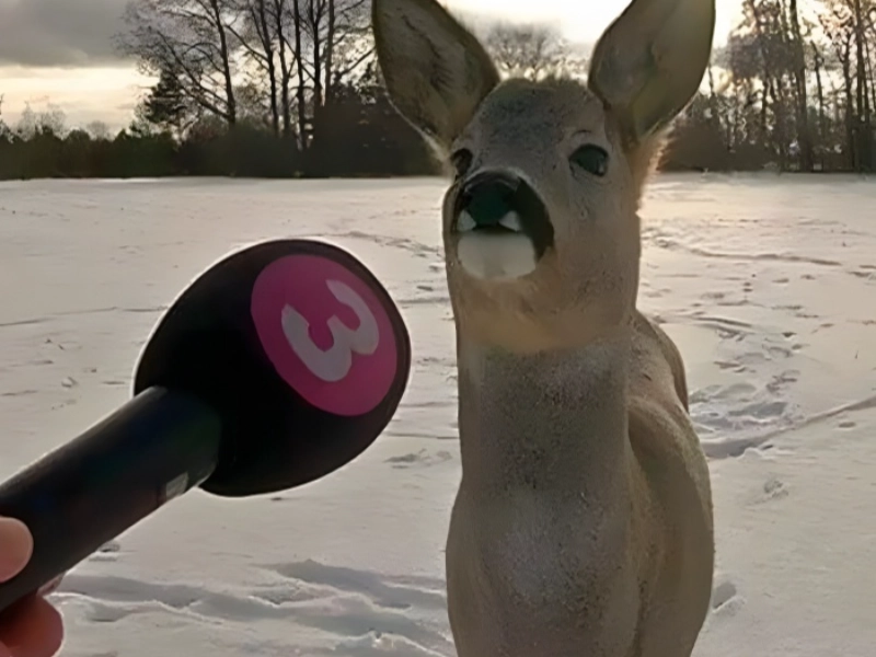 Ein Reh im Fernsehinterview sieht man nicht alle Tage. Warum die Reporterin ausgerechnet dieses Tier „befragt“, bleibt ohne Kontext ein Rätsel. Mit ein wenig Recherche erfährt man: Es stammt aus einer kanadischen Geschichte über ein Reh, das in den Hof eines Landwirts lief und sich mit dem Wachhund anfreundete.